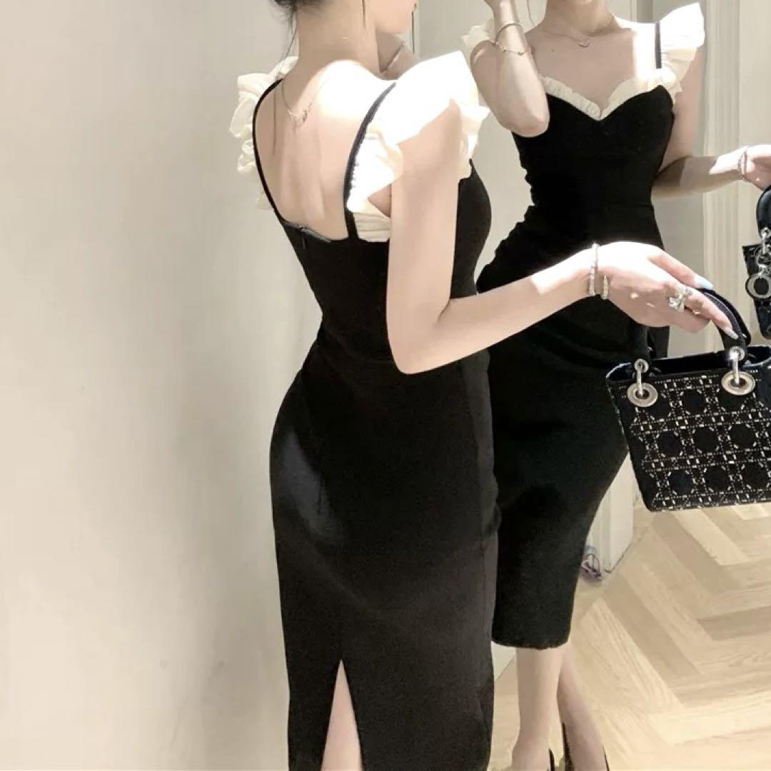 胸元と肩紐のフリルが可愛い、上品なひざ丈のタイトワンピース