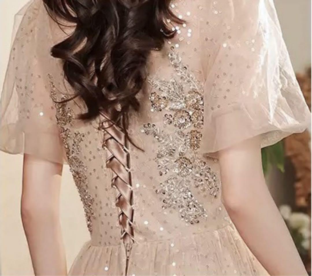 パフスリーブが可愛らしく、スパンコールとチュールが華やかなイブニングドレス
