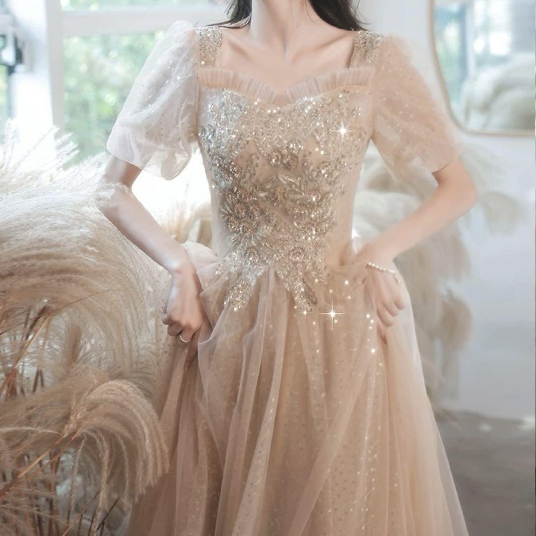 パーティードレス レディース スパンコールの煌びやかな パフスリーブ イブニングドレス 綺麗 可愛い ドレス