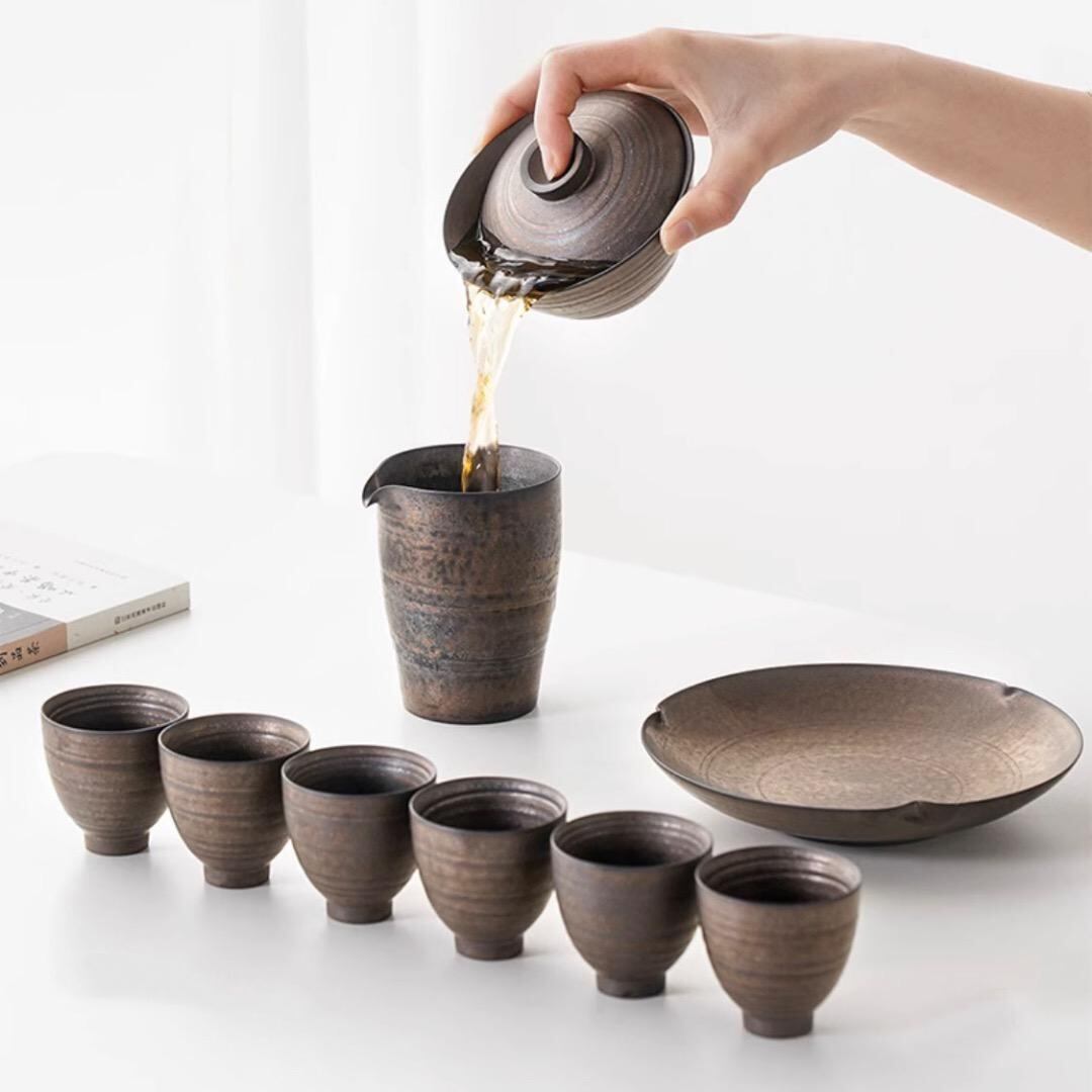 外側は、お茶の香りを寄せ付けない錆びたような釉薬が施され、規則的な螺旋状の円の模様はまさに手仕事の痕跡です。