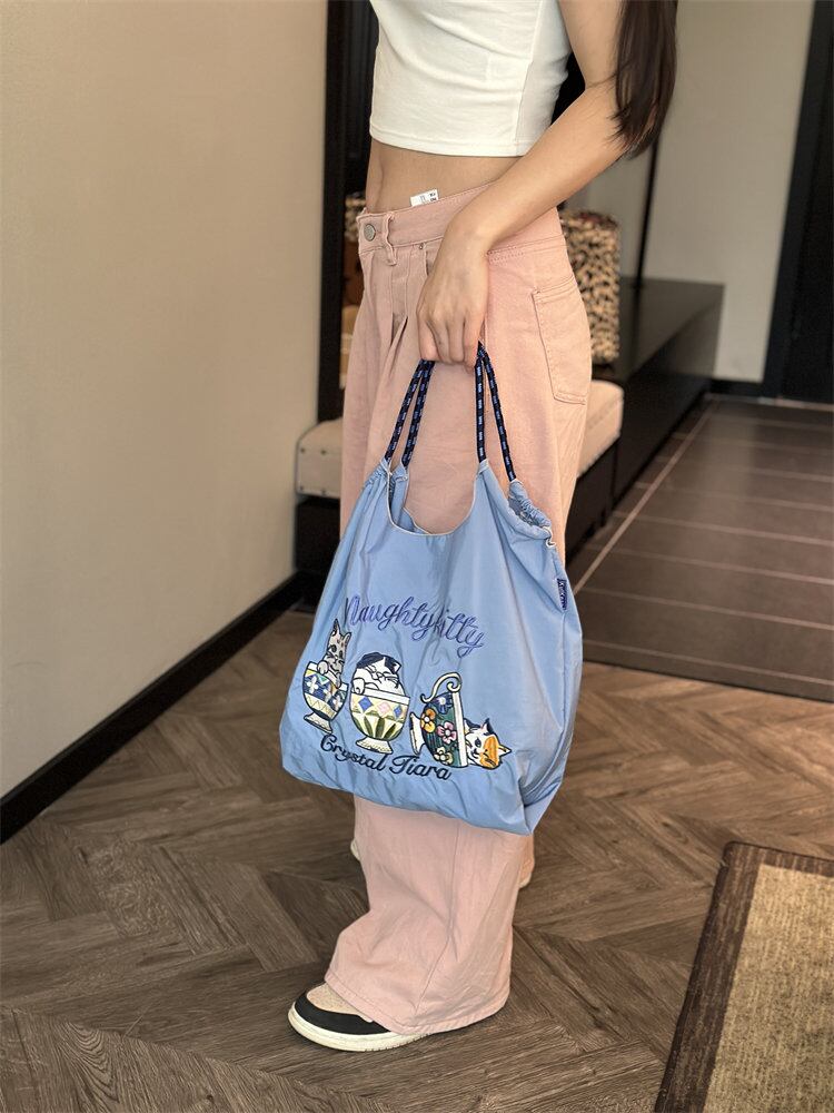 エコバッグ 猫刺繍 トートバッグ 大容量 ショルダーバッグ Mサイズ ブルー ホワイト