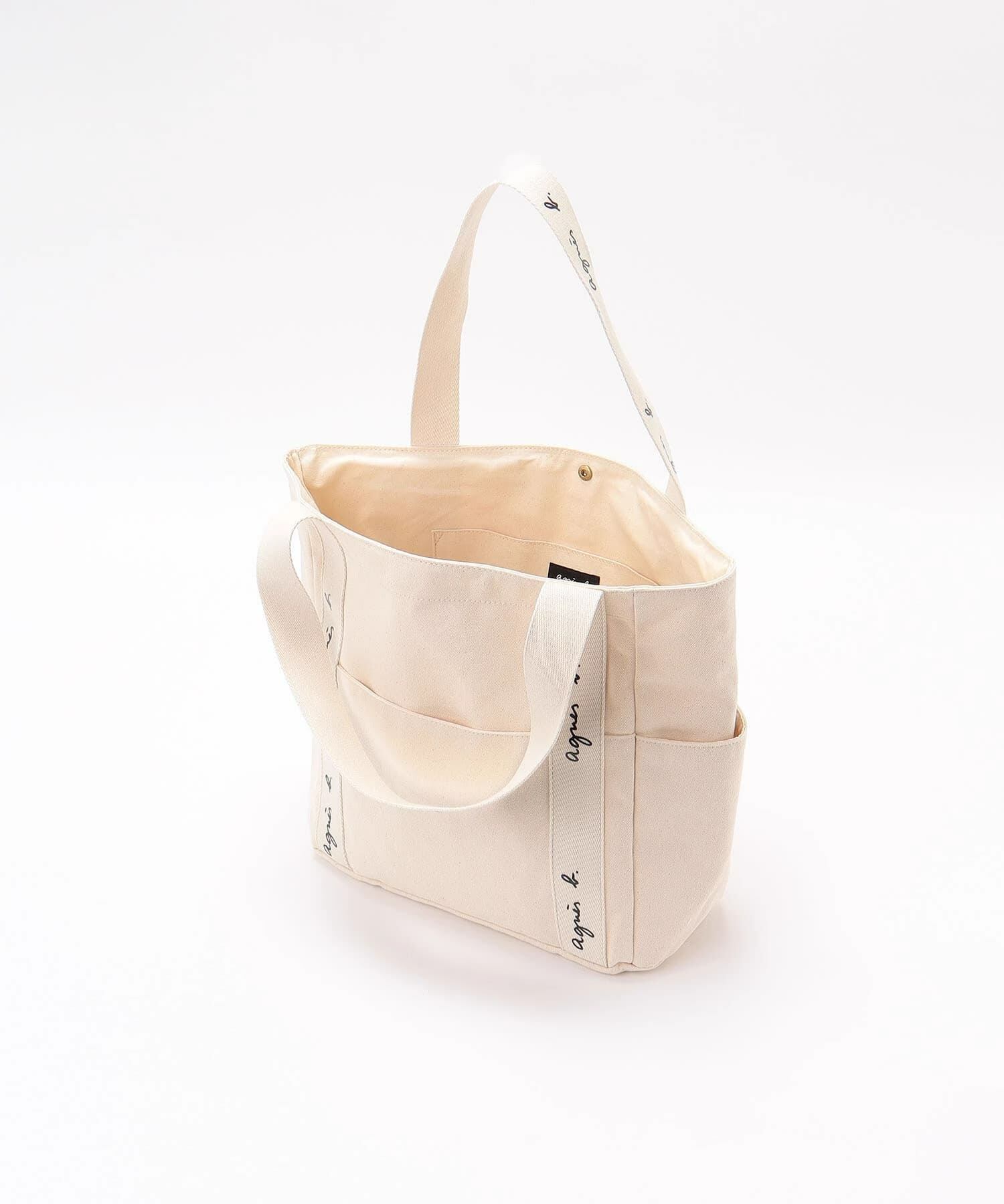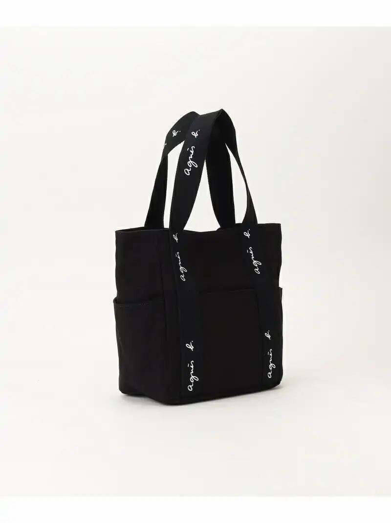 ブラックのキャンバス地にブラックのagnesb.のロゴテープの配色がシックなトートバッグ。