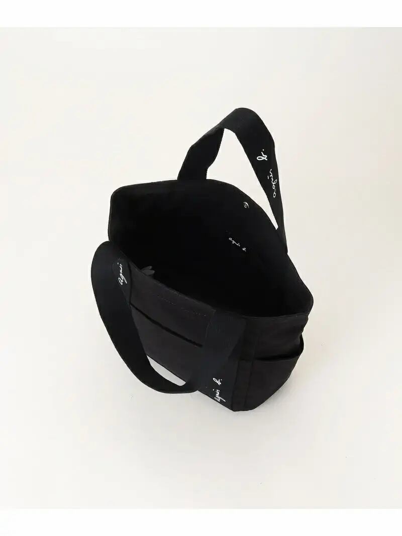 ブラックのキャンバス地にブラックのagnesb.のロゴテープの配色がシックなトートバッグ。