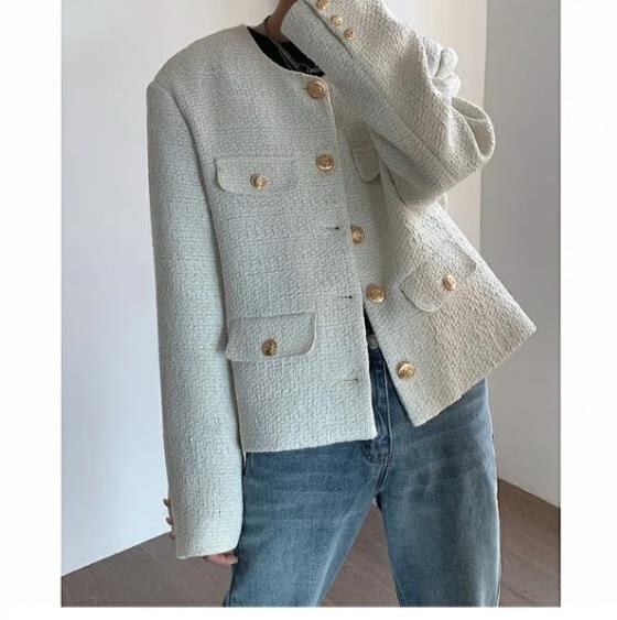 ツイード素材にクラシックなボタンディテールで高級感のあるアイテム