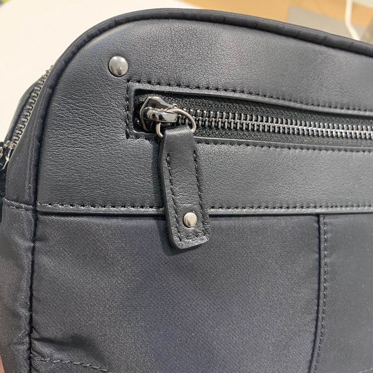 ファスナーポケットの周りを少し大きめの革でトリミングしたデザイン。