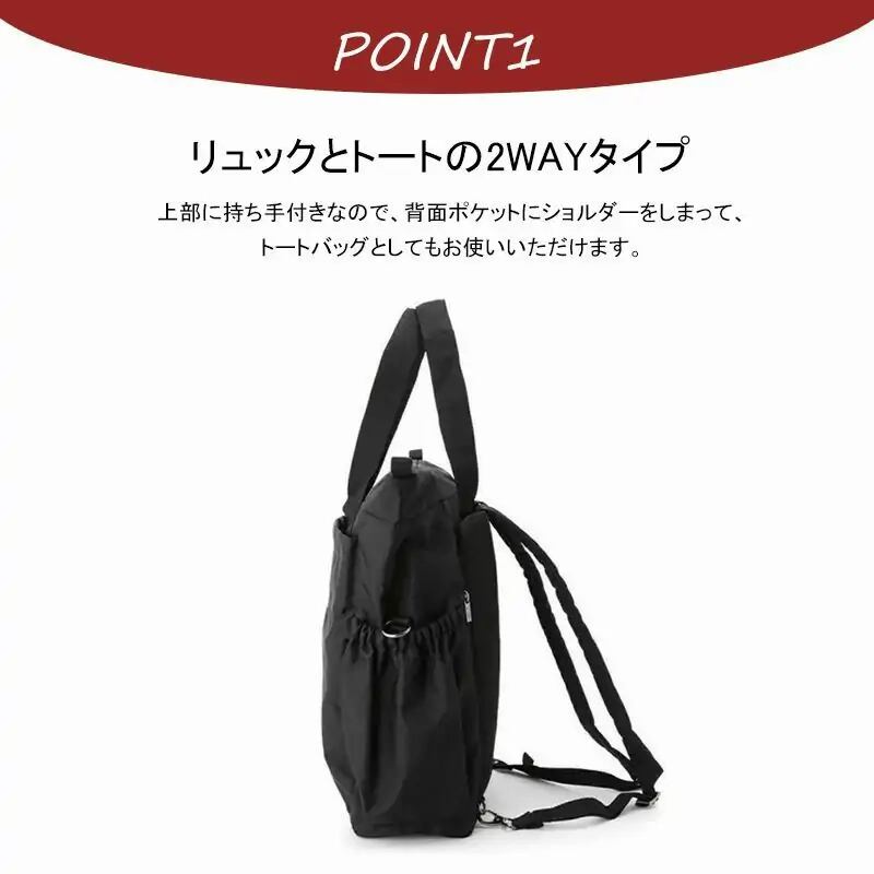 荷物が取り出しやすく、抱っこひもでのお出かけが多い人にもオススメのトートバッグと、両手が使えて肩への負担も少ないバックパックの2WAY仕様になっています。
