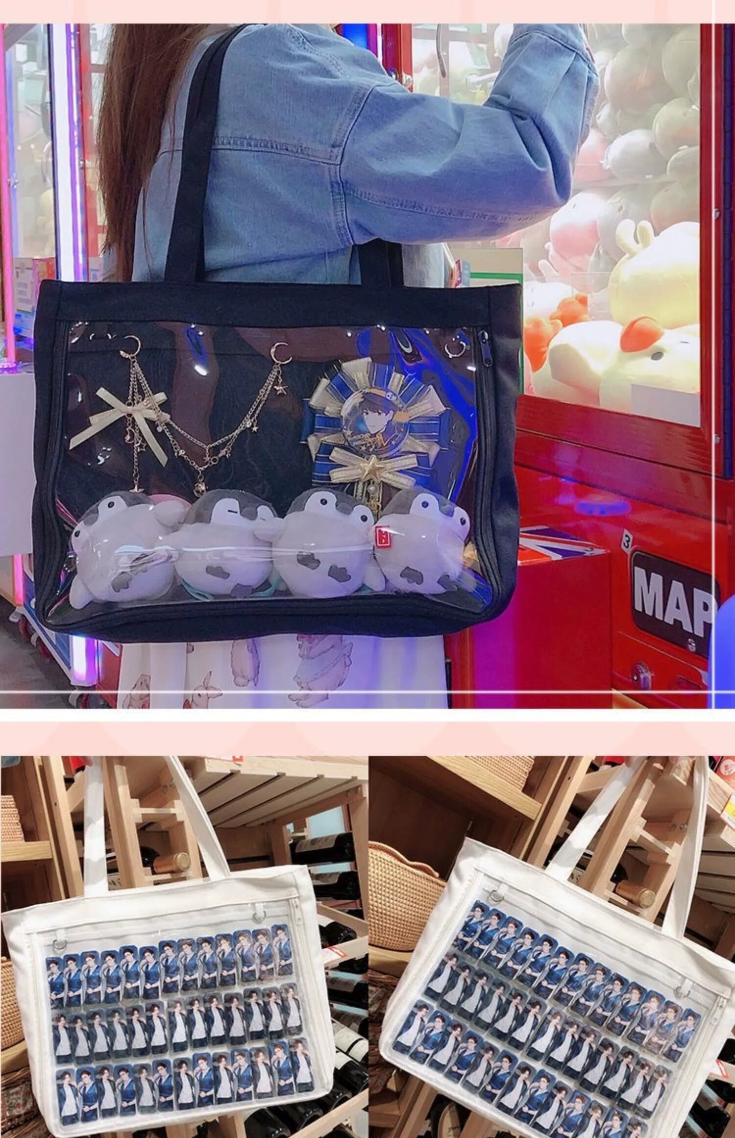 痛バッグ トートバッグ ぬいぐるみ トートバッグ クリアバッグ 肩掛け A4 ハンドル ビニール 透明窓 おしゃれ ブルー 缶バッジ キャンバス地
