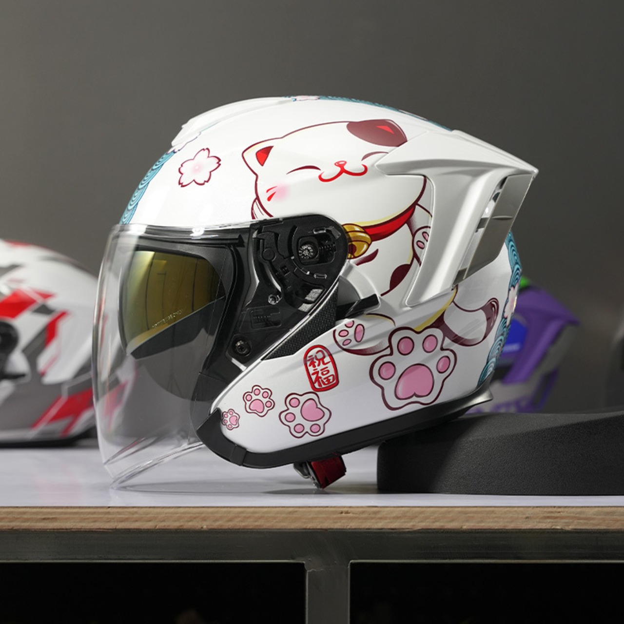 オープンフェイスヘルメット 猫 オートバイハーフヘルメット DOT 承認 メンズ レディース オートバイヘルメット バイザー付き 高品質 ハーフオープンフェイスヘルメット アウトドアライディング用 2色