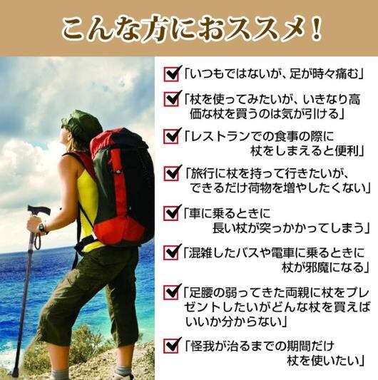 ● 持ち運びに便利な折り畳み式の杖です。コンパクトに折り畳むことができ、使わないときは付属の収納袋に入れてバッグの中に、使うときはサッと取り出して簡単に組み立てることができます。