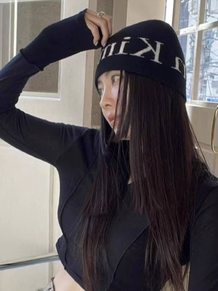 Matin Kim マーティンキム 帽子 ニット LOGO ロゴ ビーニー ストライプ 防寒 冬 韓国ファッション レディース ブラック ホワイト グレー