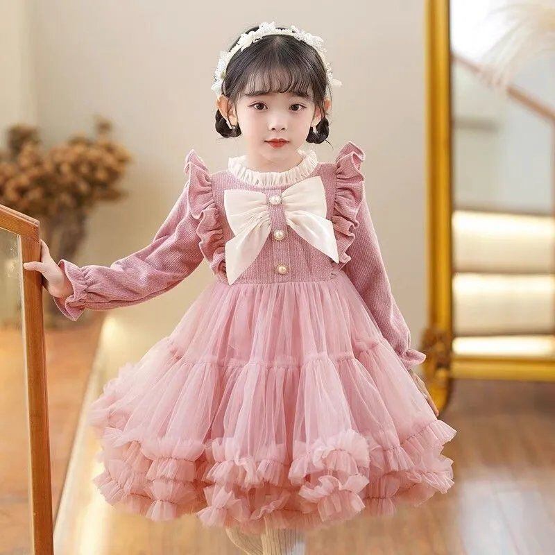 ロリータ ワンピース 女の子 子供 蝶結び 春秋 長袖 プリンセス風 ドレス ゴスロリ ステージ衣装 フリル リボン レース かわいい ピンク