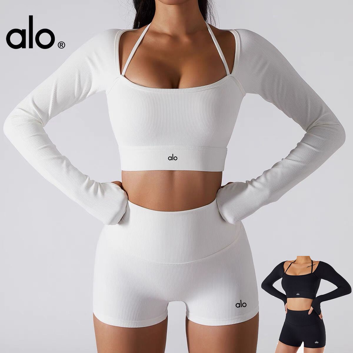 Alo Yoga アロヨガ レディース フィットネス ウェア 上下セット ショートパンツ へそ出し ヨガ タイト トレーニング 長袖 T シャツ 胸パッド付き ランニング スポーツフィットネス