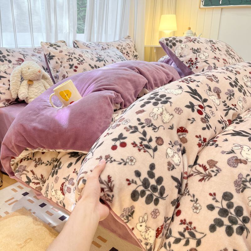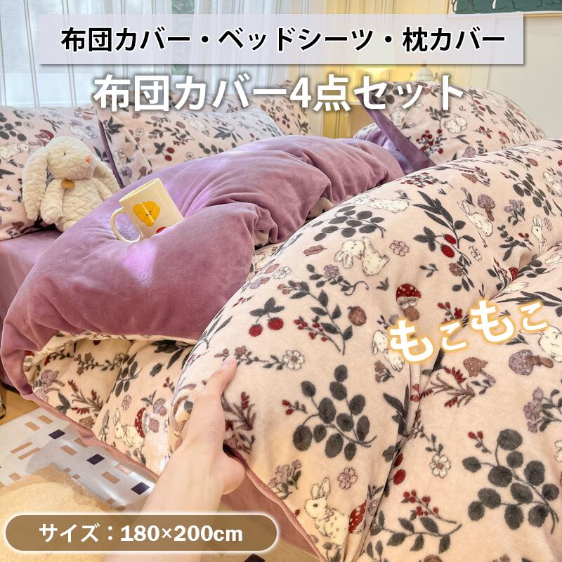 もこもこ 布団カバー 4点セット 花 模様 フランネル 洗える 掛け カバー 吸湿 発熱 暖かい 冬用 防寒 ベッドシーツ 枕カバー 寝具セット 秋冬 北欧 ホワイト×パープル