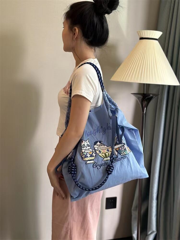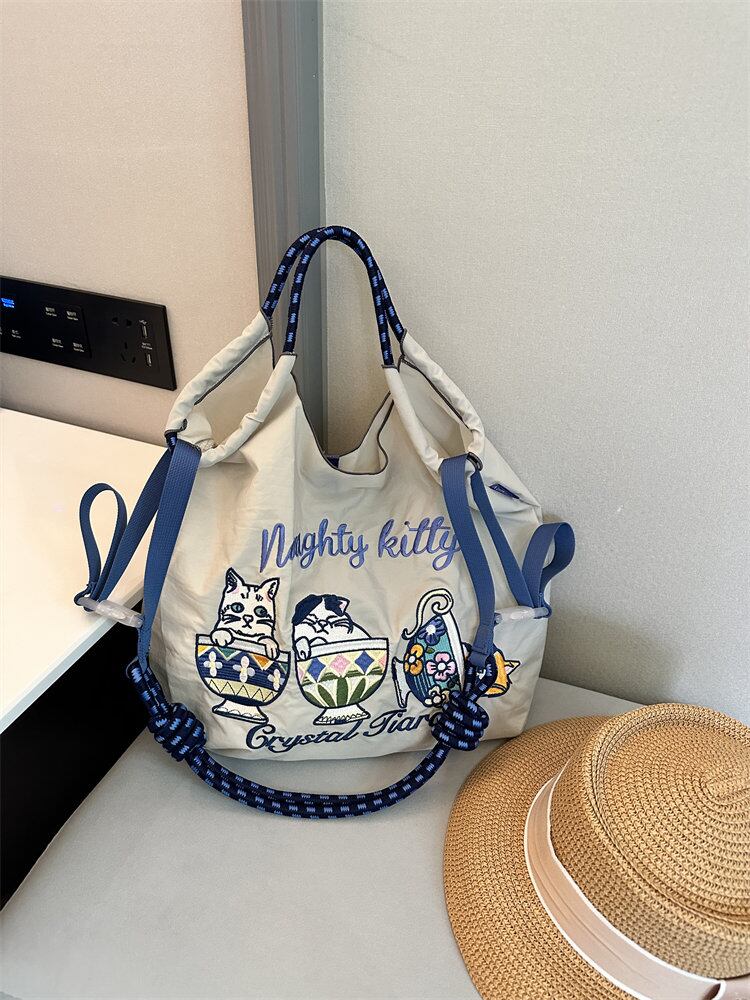 エコバッグ 猫刺繍 トートバッグ 大容量 ショルダーバッグ Mサイズ ブルー ホワイト