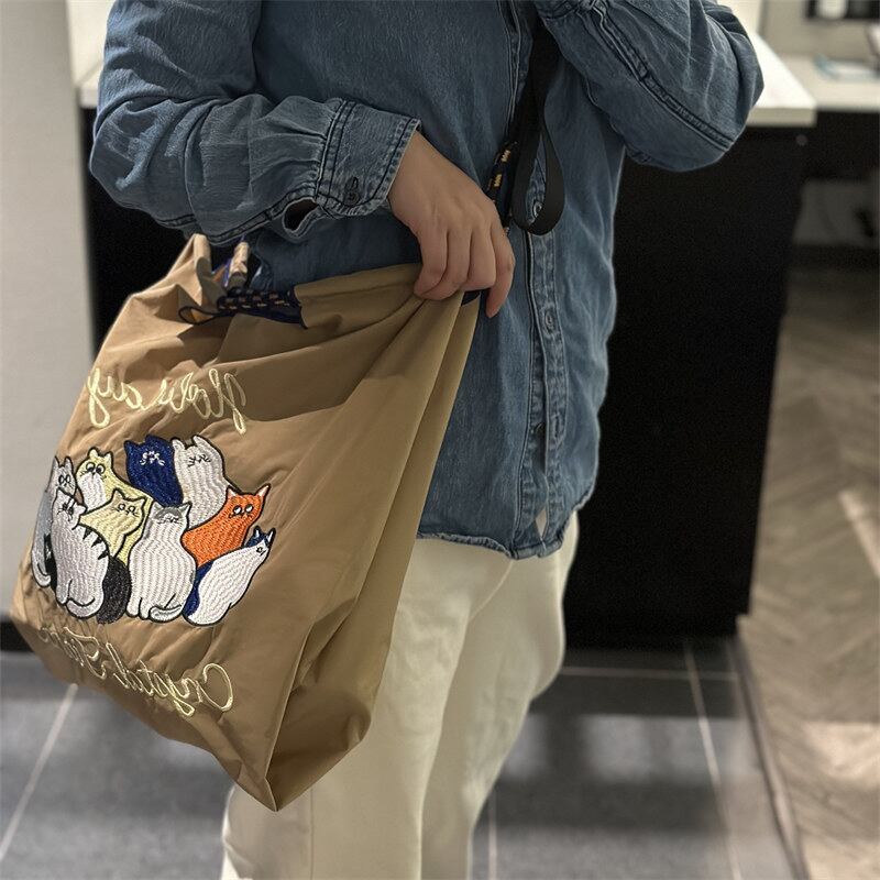 エコバッグ トートバッグ 猫刺繍 大容量 ショルダーバッグ Mサイズ カーキ色 ダークグレー